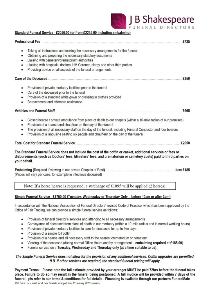 JB Shakespeare funeral Price Lists